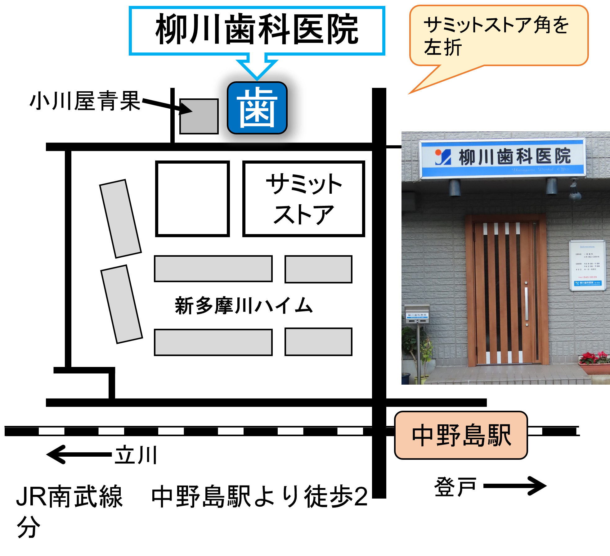 アクセス 。 柳川歯科医院 〒214-0011 神奈川県川崎市多摩区布田3-1 TEL.044-945-8039 電車の場合 JR南武線中野島駅改札をを出て、線路を渡り、サミットストアの角を左折してすぐです。八百屋さんとプライムコーポレーションさんの間です。 徒歩2~3分です。 自動車の場合 医院の前に小型車1台分あります。